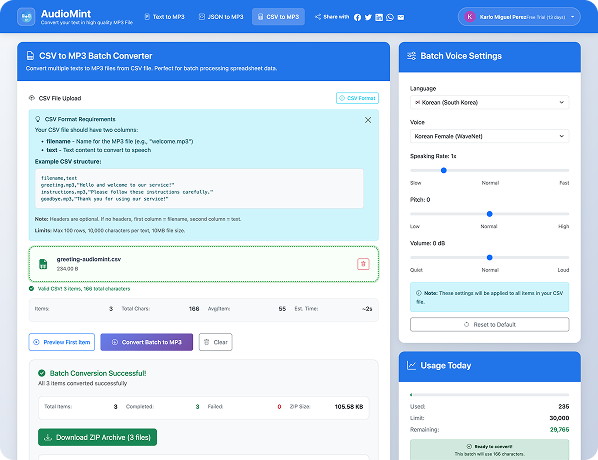 고급 신경망 음성 합성, JSON 및 CSV 형식을 지원하는 배치 처리, 속도 및 음조 조절을 위한 프로소디 제어, 자동 MP3 인코딩, 리소스 관리를 위한 사용량 추적 기능을 갖춘 웹 기반 텍스트 음성 변환 플랫폼.