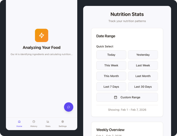 GPT-4 Vision API를 통한 즉각적인 음식 인식, 자동 칼로리 계산, 시각적 분석을 통한 포션 크기 추정, 최소한의 사용자 입력, 오프라인 기능, iOS 및 Android에서 설치 가능한 기능을 갖춘 카메라 우선 AI 음식 추적 PWA.