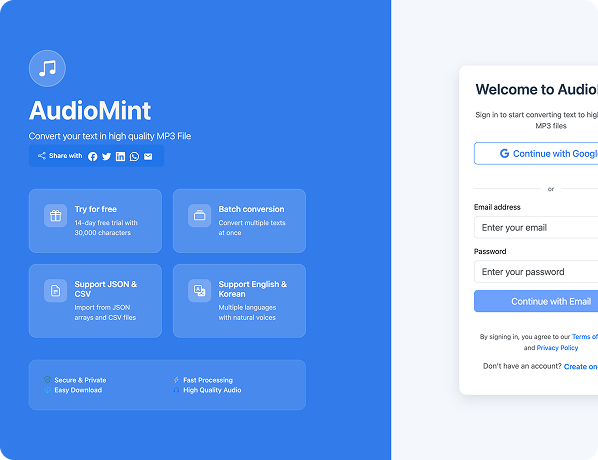 AudioMint는 오디오 콘텐츠 제작의 패러다임 전환—전문 제작에서 자동화 생성으로의 전환을 대표합니다. 장비와 전문 지식 장벽을 없애 어떤 콘텐츠 볼륨에서도 오디오 접근성을 경제적으로 실현 가능하게 만들었습니다.