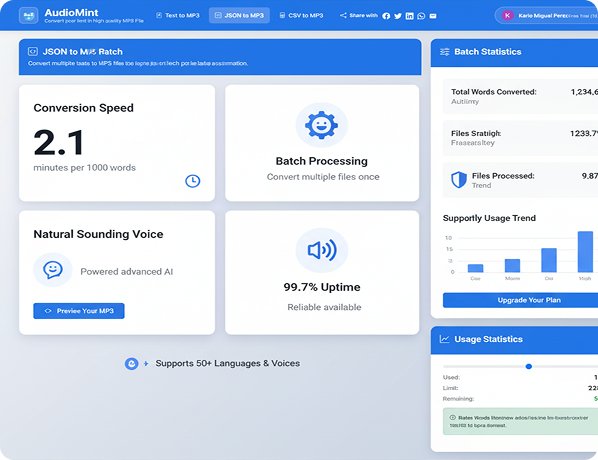 고급 신경망 음성 합성, JSON 및 CSV 형식을 지원하는 배치 처리, 속도 및 음조 조절을 위한 프로소디 제어, 자동 MP3 인코딩, 리소스 관리를 위한 사용량 추적 기능을 갖춘 웹 기반 텍스트 음성 변환 플랫폼.