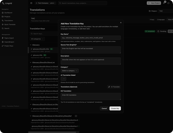 AI 기반 실시간 번역, 계층적 키 구성, 협업 워크플로우, 버전 관리, 다중 형식 내보내기를 갖춘 포괄적인 번역 관리 플랫폼—개발팀 프로세스와 완전히 통합.